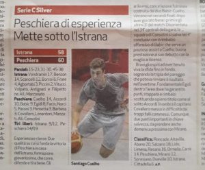 El concordiense Santiago Cuelho se encuentra realizando su primera experiencia en el básquetbol del exterior con la camiseta del Arilica Basket Peschiera de la Serie C2 Silver de Italia (quinta categoría nacional).