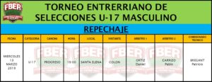 Este miércoles se llevará adelante el partido de Repechaje categoría U17 entre las selecciones asociativas de Santa Elena y Colón. El duelo se desarrollará a las 19 horas en el Club Progreso Social y Deportivo de Santa Elena.